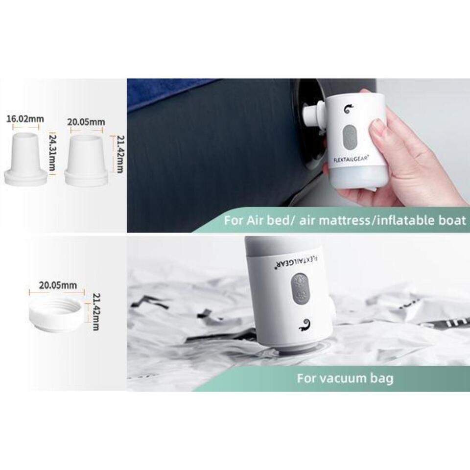 5つの特別なインフレータブルノズルを備えており、フロアマット、フローティングベッド、ブリスター、インフレータブルおもちゃなど、市場のさまざまなインフレータブル製品の95%以上に適合します。平均して、1 人用のインフレータブル フロア マットは約 1 分で完全に充電できます。